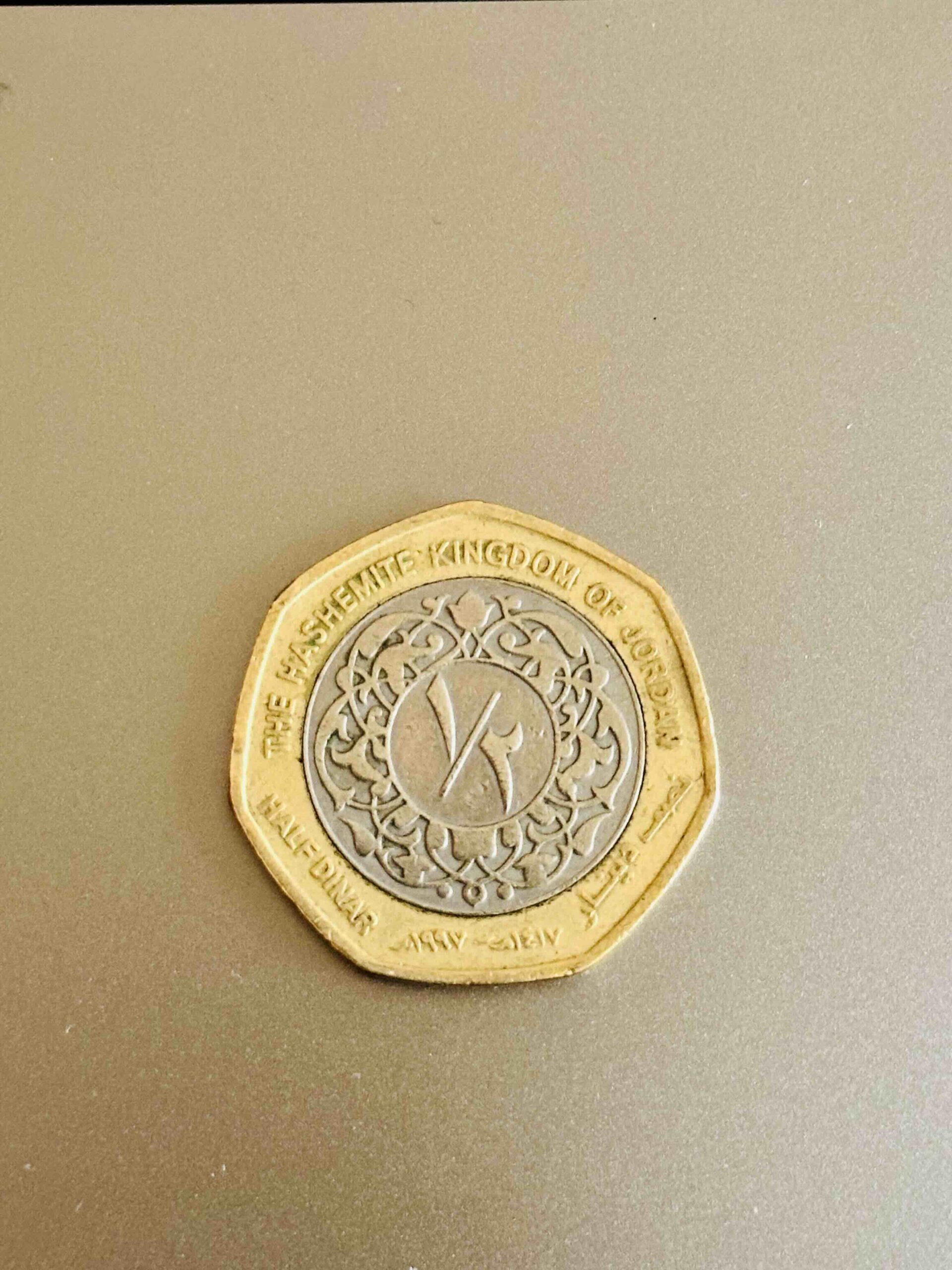 Solid and balanced, the half-dinar coin blends practicality with regal detail. Its golden center and silver rim catch the sun like the cliffs of Wadi Musa. The Hashemite crest glows proudly, reminding each holder of Jordan’s enduring sovereignty. Common in daily exchanges, it feels substantial in hand — a reassuring token of value that moves seamlessly from city markets to desert towns.