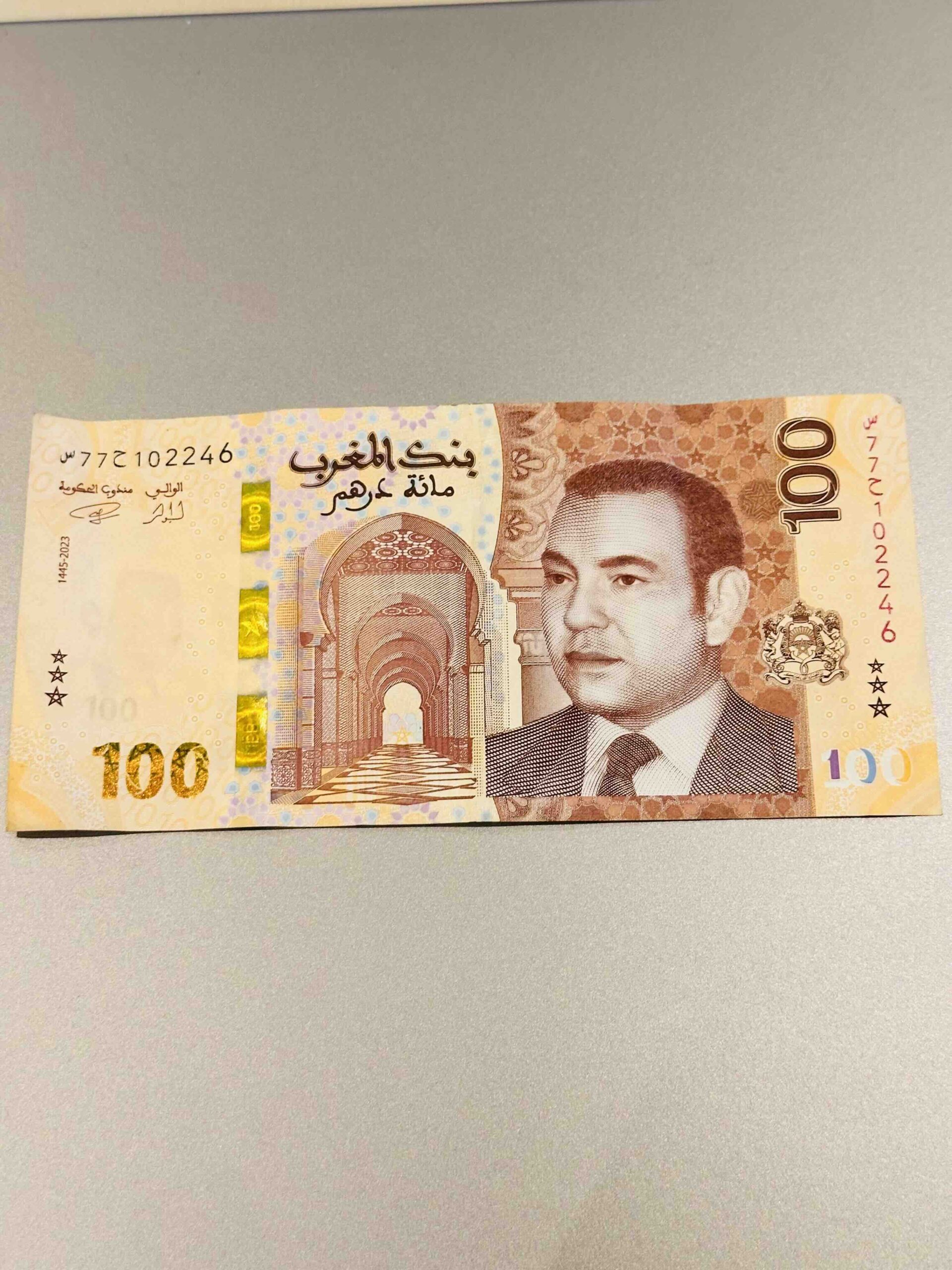 A distinguished Moroccan 100 Dirhams banknote, rich in color and cultural symbolism. Adorned with the image of King Mohammed VI and intricate geometric patterns, it reflects Morocco’s deep blend of history, artistry, and modern progress. The vivid tones and Arabic calligraphy capture the spirit of North Africa’s gateway — where tradition meets innovation. Each crease and mark on this note tells its own story from the bustling souks of Marrakech to the calm winds of the Sahara. A timeless piece of Morocco’s living economy and identity.